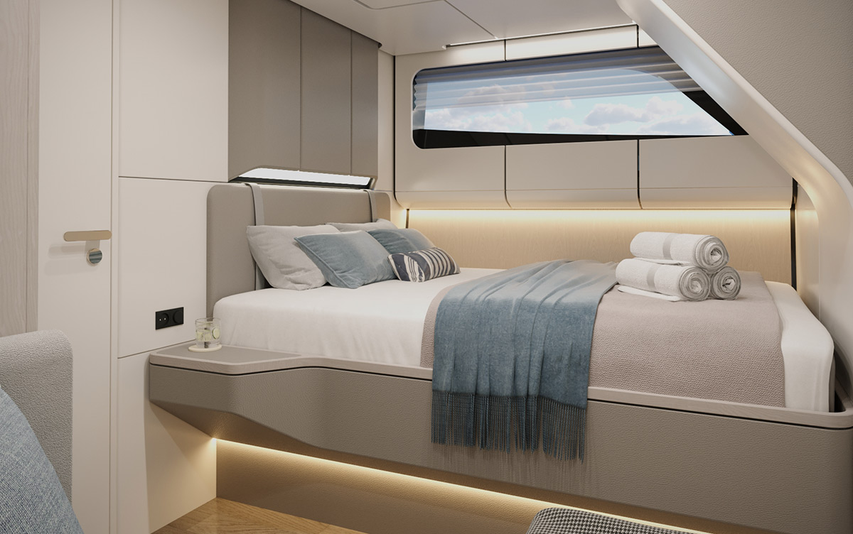 The master cabin, a standout feature of the lower deck in the Blue Cosmo 52 Soft Top variant, offers a private sanctuary of luxury and spacious design that is consistent with all Blue Cosmo 52 models. This area of retreat comes complete with a private bathroom and lavatory space.