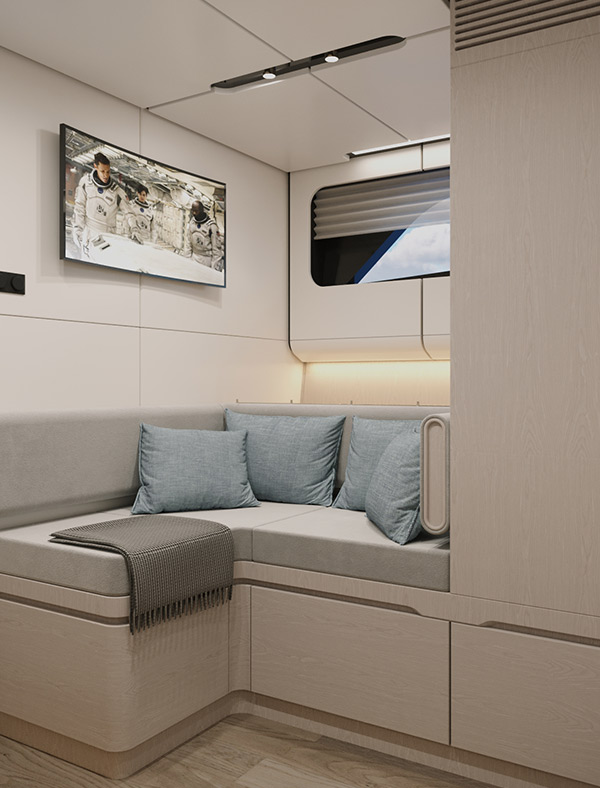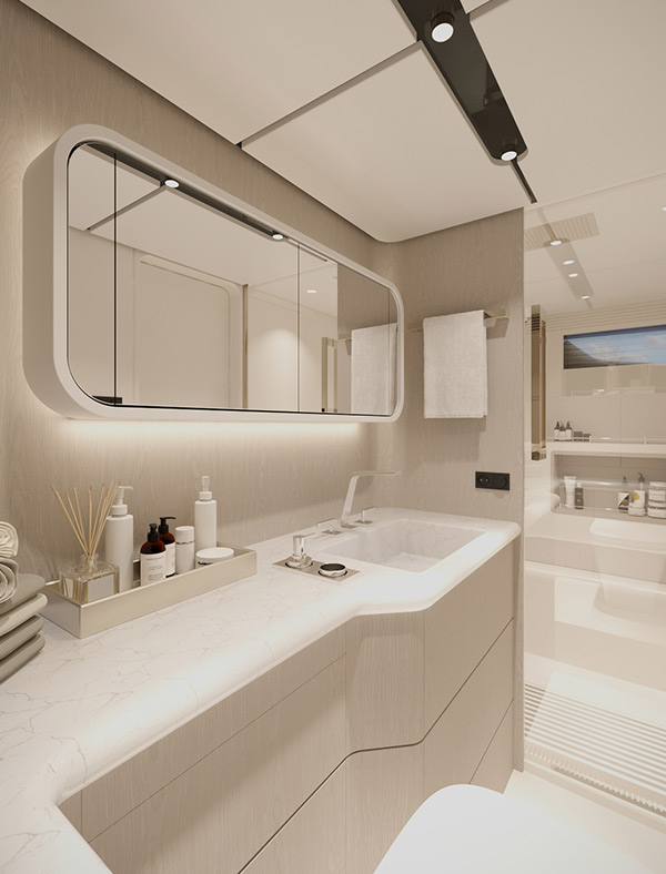 As an alternative to the lower deck saloon, an additional VIP guest cabin may be offered to our customers. The VIP guest cabin offers a first-class experience that rivals the master suite. The room is defined by its striking central bed with a sculpted, floating base, framed by elegant dark wood paneling and soft ambient lighting that creates a warm, inviting atmosphere.