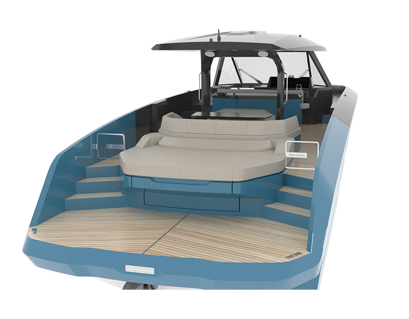 Designed with attention to the finest details, the main deck of the Blue Cosmo 52 Soft Top variant balances open-space functionality with sheltered comfort. The elegant soft top provides generous coverage, ensuring you and your guests remain cool and comfortable even during the peak of summer.